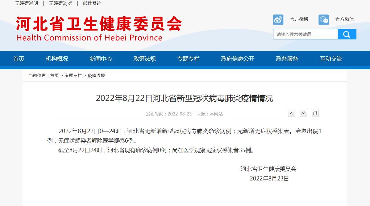 截至8月22日24时,河北省现有确诊病例0例;尚在医学观察无症状感染者35例。